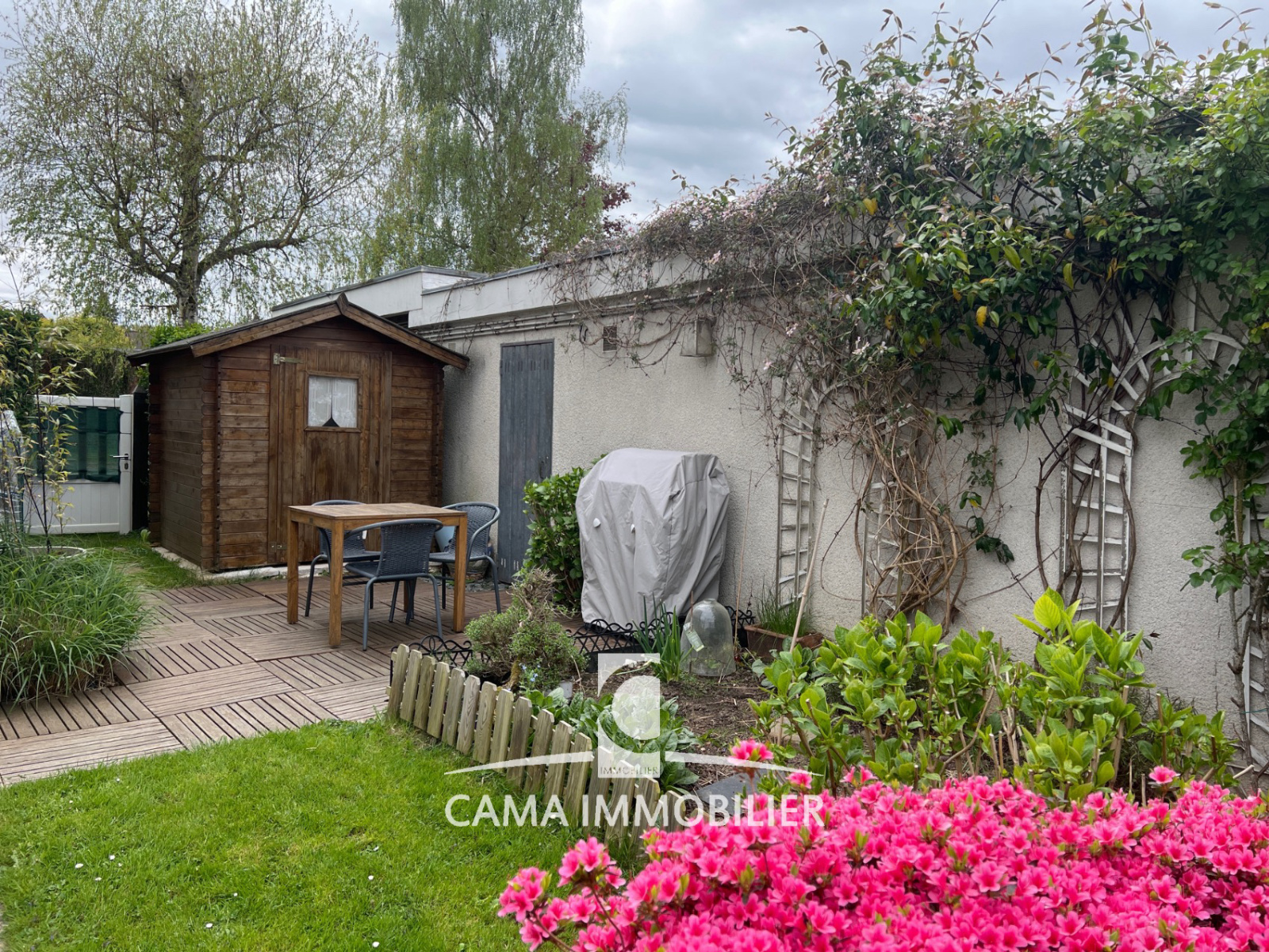 Très joli jardin arboré avec sa terrasse et son abri de jardin.
